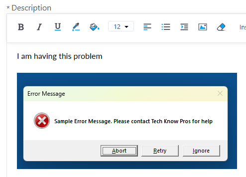 - Description: More detailed description of the issue or request. You can copy and paste screenshots directly in this field.