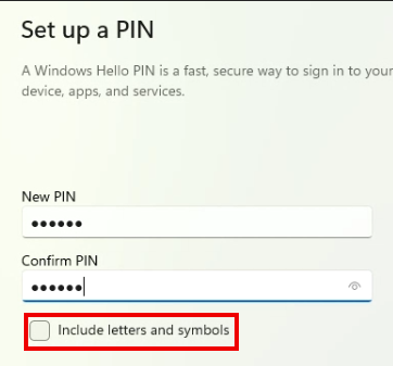 Set up a pin. It needs to be six numbers long. If you want to include letters or symbols, click the checkbox as outlined below.